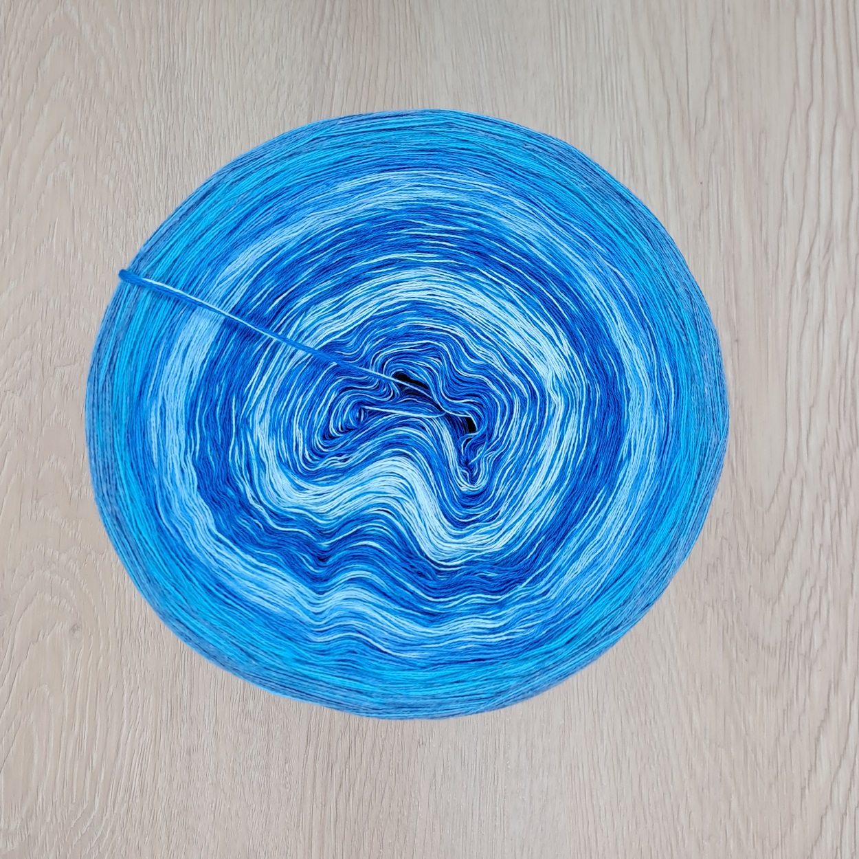 Dieser Bobbel ist im sanften Verlauf gewickelt (die Farben wechseln in gleichen Abständen OHNE uni-Abschnitte).