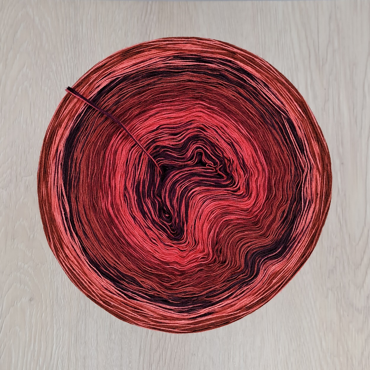 Dieser Bobbel ist im sanften Verlauf gewickelt (die Farben wechseln in gleichen Abständen OHNE uni-Abschnitte).