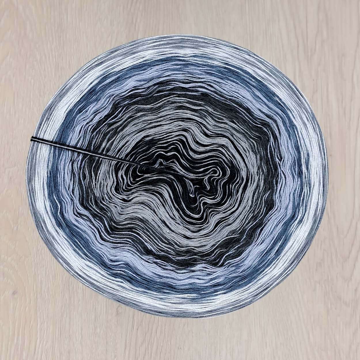 Dieser Bobbel ist im sanften Verlauf gewickelt (die Farben wechseln in gleichen Abständen OHNE uni-Abschnitte).