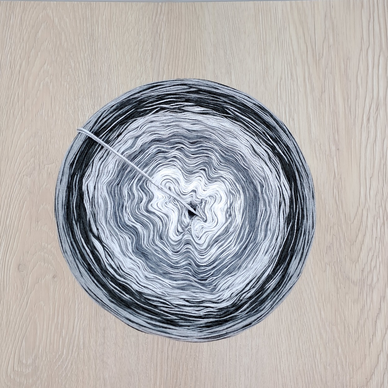 Dieser Bobbel ist im sanften Verlauf gewickelt (die Farben wechseln in gleichen Abständen OHNE uni-Abschnitte).
