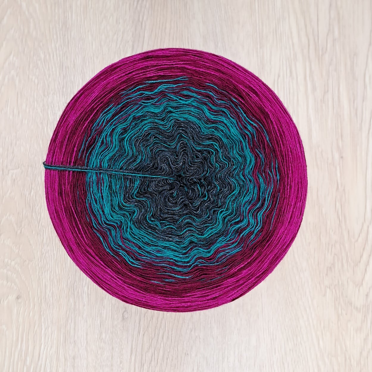 Dieser Bobbel ist im sanften Verlauf gewickelt (die Farben wechseln in gleichen Abständen OHNE uni-Abschnitte).