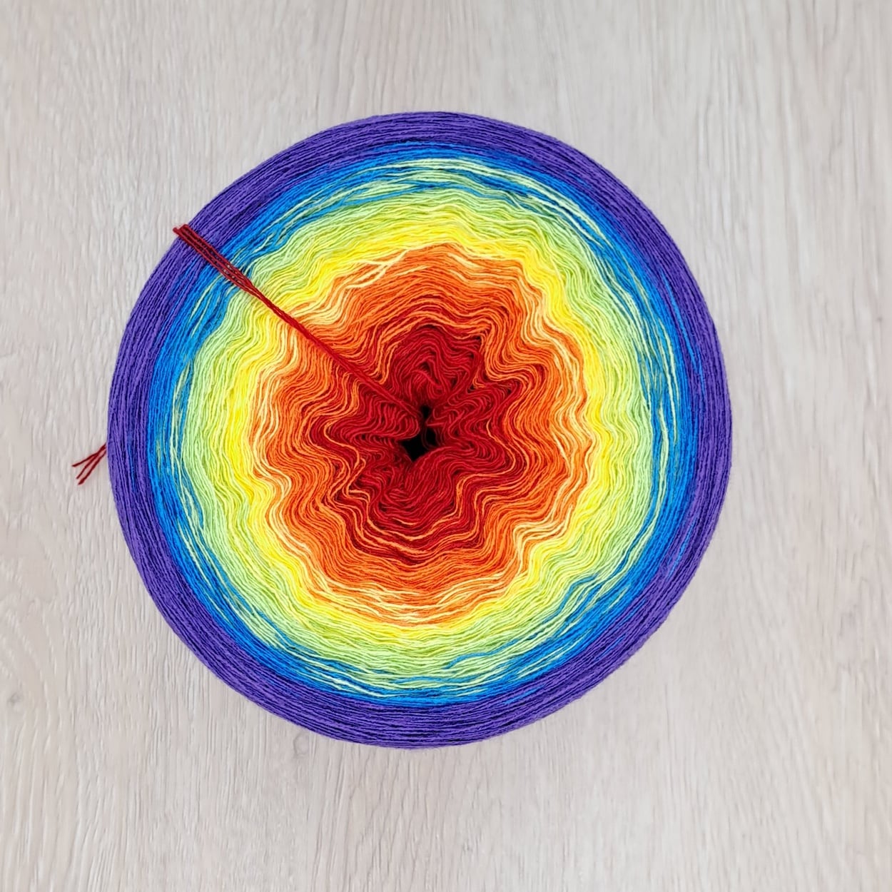Dieser Bobbel ist im normalen Verlauf gewickelt (die Farben wechseln in gleichen Abständen von uni zu uni).