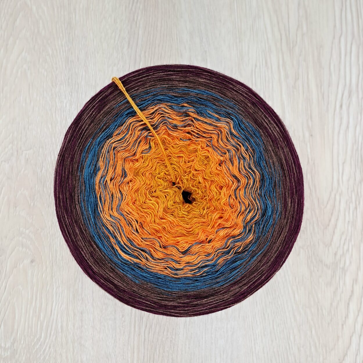 Dieser Bobbel ist im sanften Verlauf gewickelt (die Farben wechseln in gleichen Abständen OHNE uni-Abschnitte).