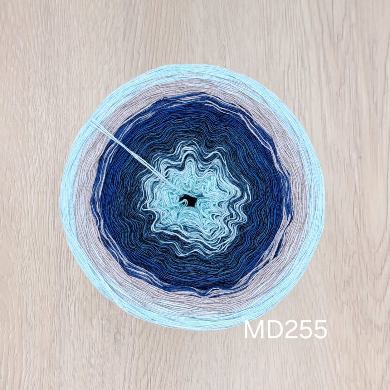 Dieser Bobbel ist im normalen Verlauf gewickelt (die Farben wechseln in gleichen Abständen von uni zu uni).