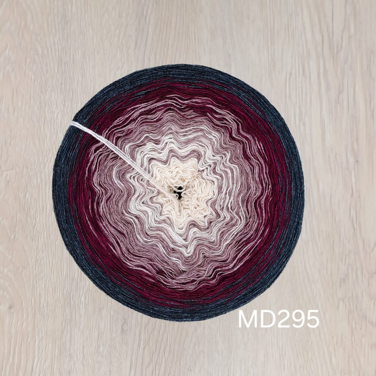 Dieser Bobbel ist im normalen Verlauf gewickelt (die Farben wechseln in gleichen Abständen von uni zu uni).