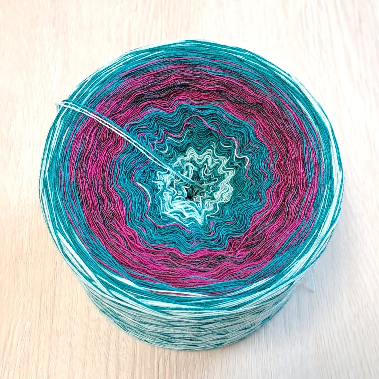 Dieser Bobbel ist im sanften Verlauf gewickelt (die Farben wechseln in gleichen Abständen OHNE uni-Abschnitte).